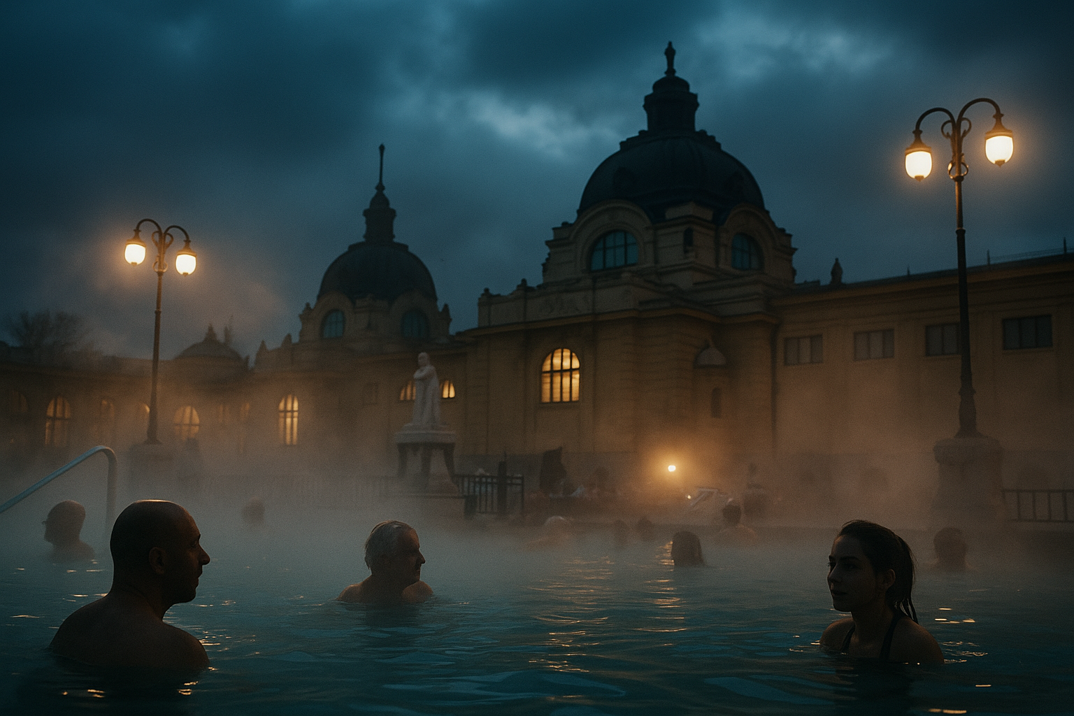 Széchenyi – iconic yellow building, outdoor pools, steam, a mix of tourists and locals playing chess in the water.