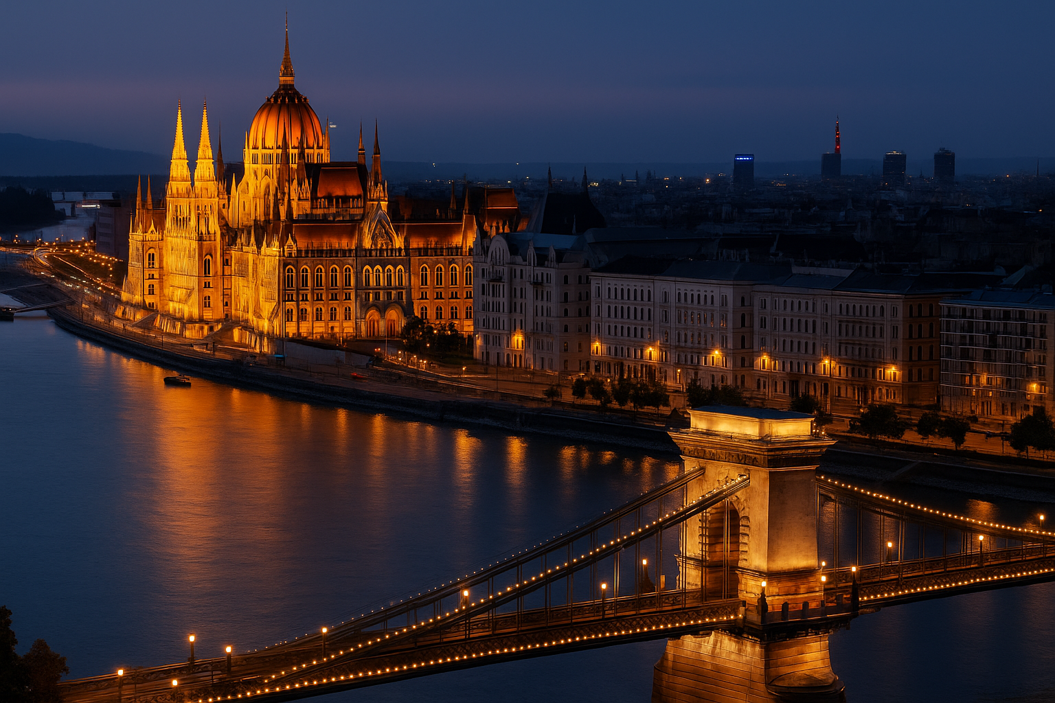 River & lights version – Parliament, river walk, evening bridge crossing, one bath, Pest nightlife taster.